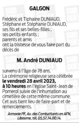 Veuf de Madame Jeannine DUNIAUD